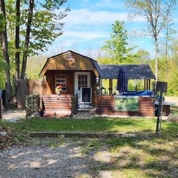 clean porta potty / outhouse, a camp store, an outdoor kitchen area and pavilion.